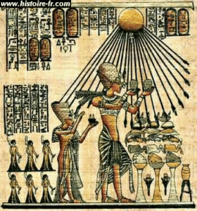 Aton désigne « le disque » solaire ou lunaire. Il occupe une place à part dans le panthéon égyptien. A l’époque amarnienne Aton ne se manifeste que sous l’apparence d’un disque solaire dont les quatorze rayons constituent des bras terminés par des mains qui viennent effleurer le pharaon (Akhenaton) et la reine (Néfertiti) accomplissant le culte.